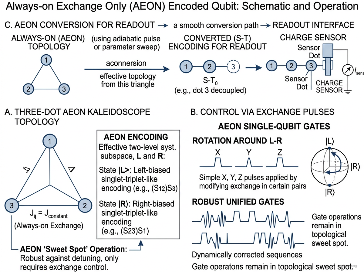 The Always-on Exchange-Only (AEON) qubit is a three-spin encoded qubit in a linear triple quantum dot (TQD) array where the nearest-neighbor exchange couplings (dots 1–2) and (dots 2–3) are kept permanently on. There is no direct tunnel coupling between the outer dots (). The qubit is encoded in the subspace of three singly-occupied quantum dots in the (1,1,1) charge configuration.