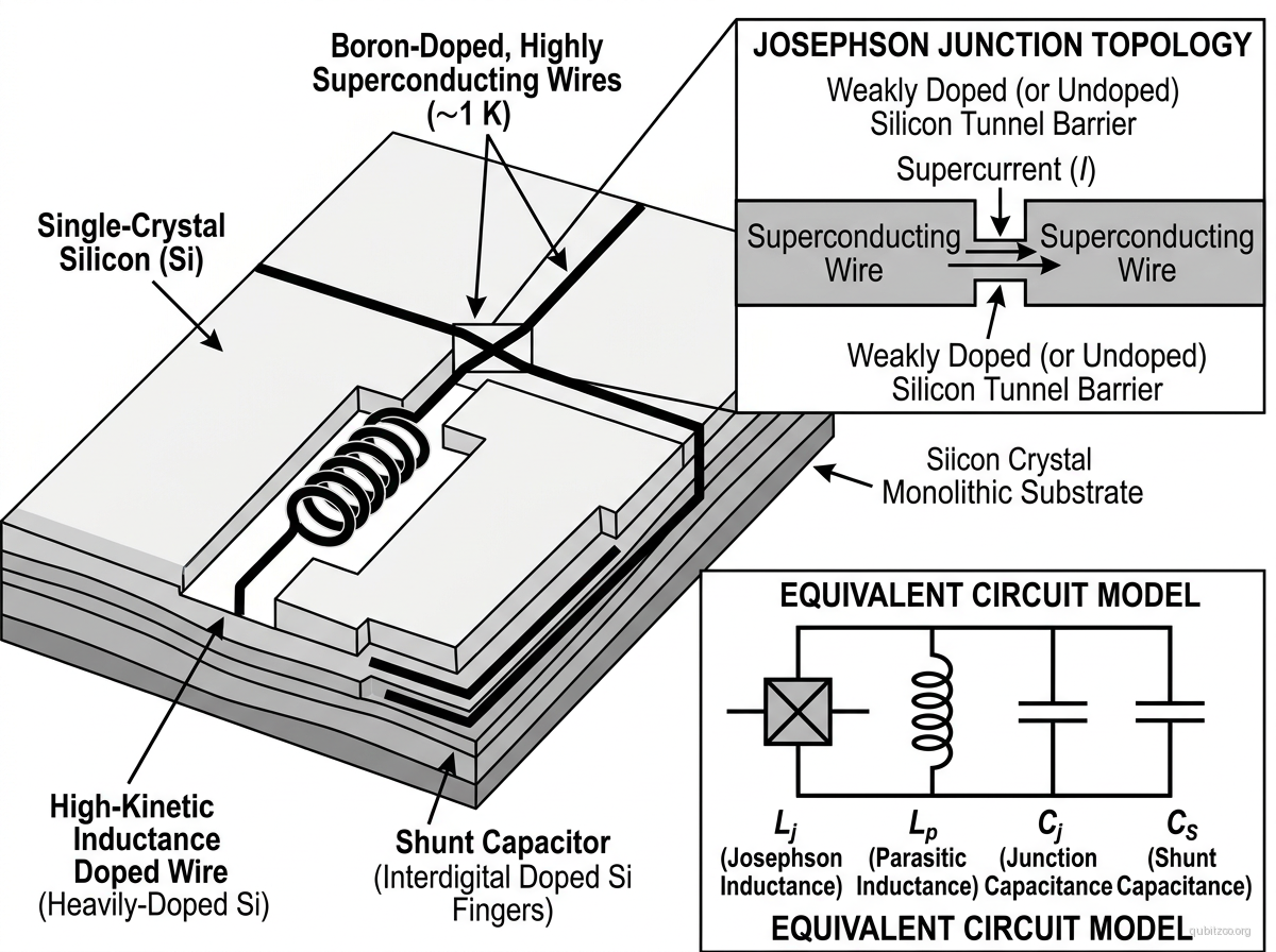 The all-semiconductor superconducting qubit is a proposed architecture in which every component of a superconducting quantum circuit — Josephson junctions, wires, inductors, capacitors — is fabricated within a single group-IV semiconductor crystal (Si or Ge) using precision atomic-scale doping. The heavily doped regions become superconducting below ~1 K, and the undoped crystal between them forms the tunnel barrier. No deposited metal is involved: superconductivity is intrinsic to the doped semiconductor.