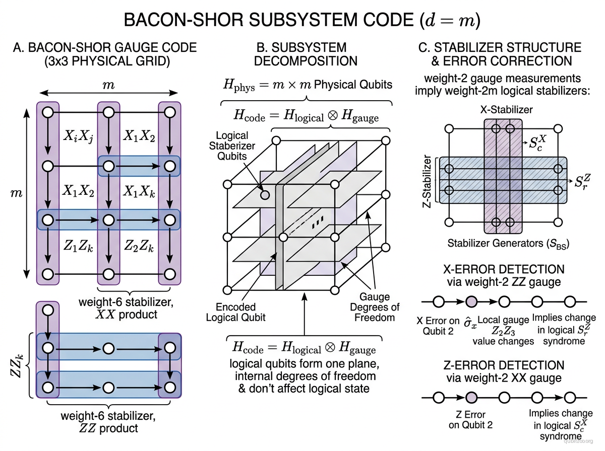 The Bacon-Shor code exploits the subsystem code framework: the physical Hilbert space decomposes into a logical subsystem, a gauge subsystem, and a stabilizer-fixed subsystem. Only the logical subsystem encodes information; the gauge subsystem is “don’t care” degrees of freedom.
