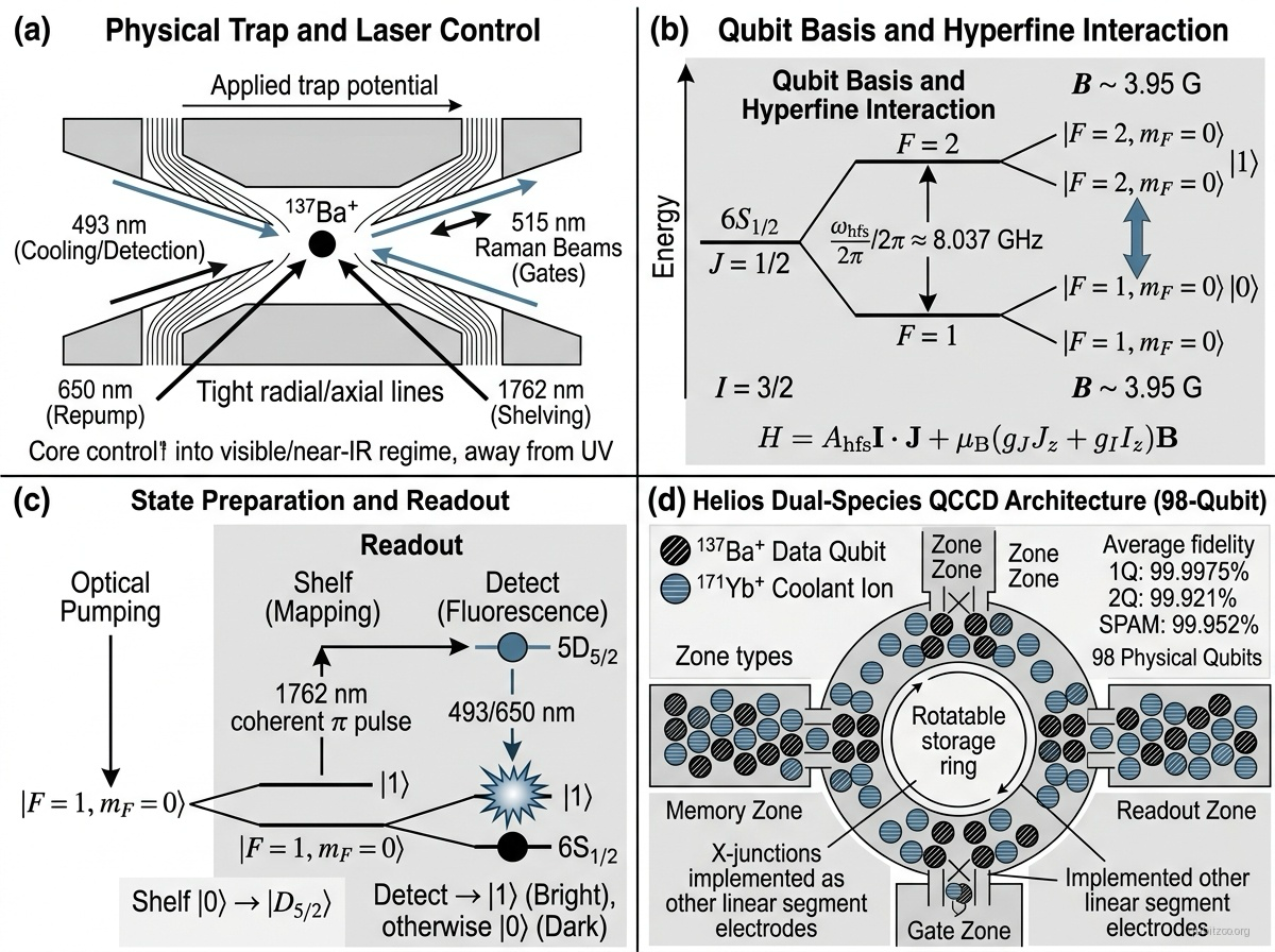 Quantinuum’s Helios processor made the first barium-based species deployed in a large-scale trapped-ion quantum computer. Helios is a 98-qubit QCCD processor with data qubits and co-trapped coolant ions for sympathetic recooling. Averaged over its operational zones, Helios reports single-qubit, two-qubit, and SPAM infidelities of , , and respectively, corresponding to fidelities of 99.9975%, 99.921%, and 99.952%. In 2026, the same Helios hardware was used to demonstrate encoded computations with 48 to 94 logical qubits using high-rate iceberg codes.