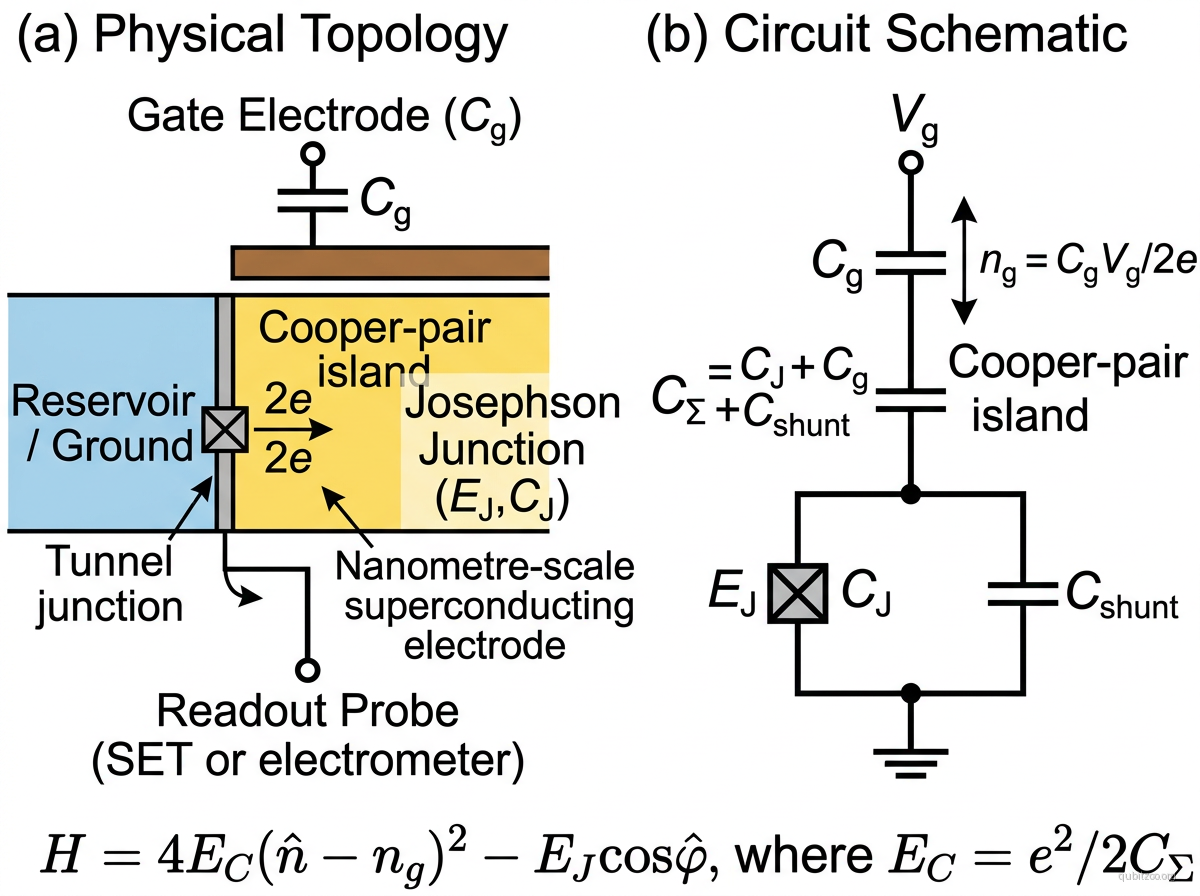Operating in the charge regime , the qubit states are charge states and differing by one Cooper pair. At the charge degeneracy point , the two lowest states are split by . Gate voltage tunes , controlling the qubit transition frequency. Highly sensitive to charge noise at generic operating points.