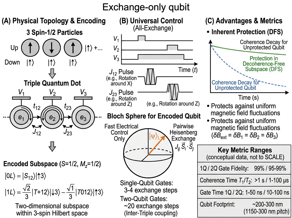 Universal control uses only pairwise Heisenberg exchange between any pair in the triple dot — no magnetic fields or gradients needed. The encoding forms a decoherence-free subspace against collective dephasing.