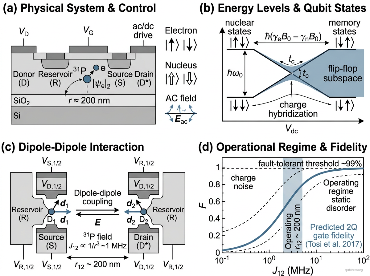 - Fabrication tolerance: the ~200 nm coupling range means donors need only be placed with ~50 nm precision (vs. ~1 nm for exchange-coupled qubits), potentially compatible with advanced CMOS lithography.