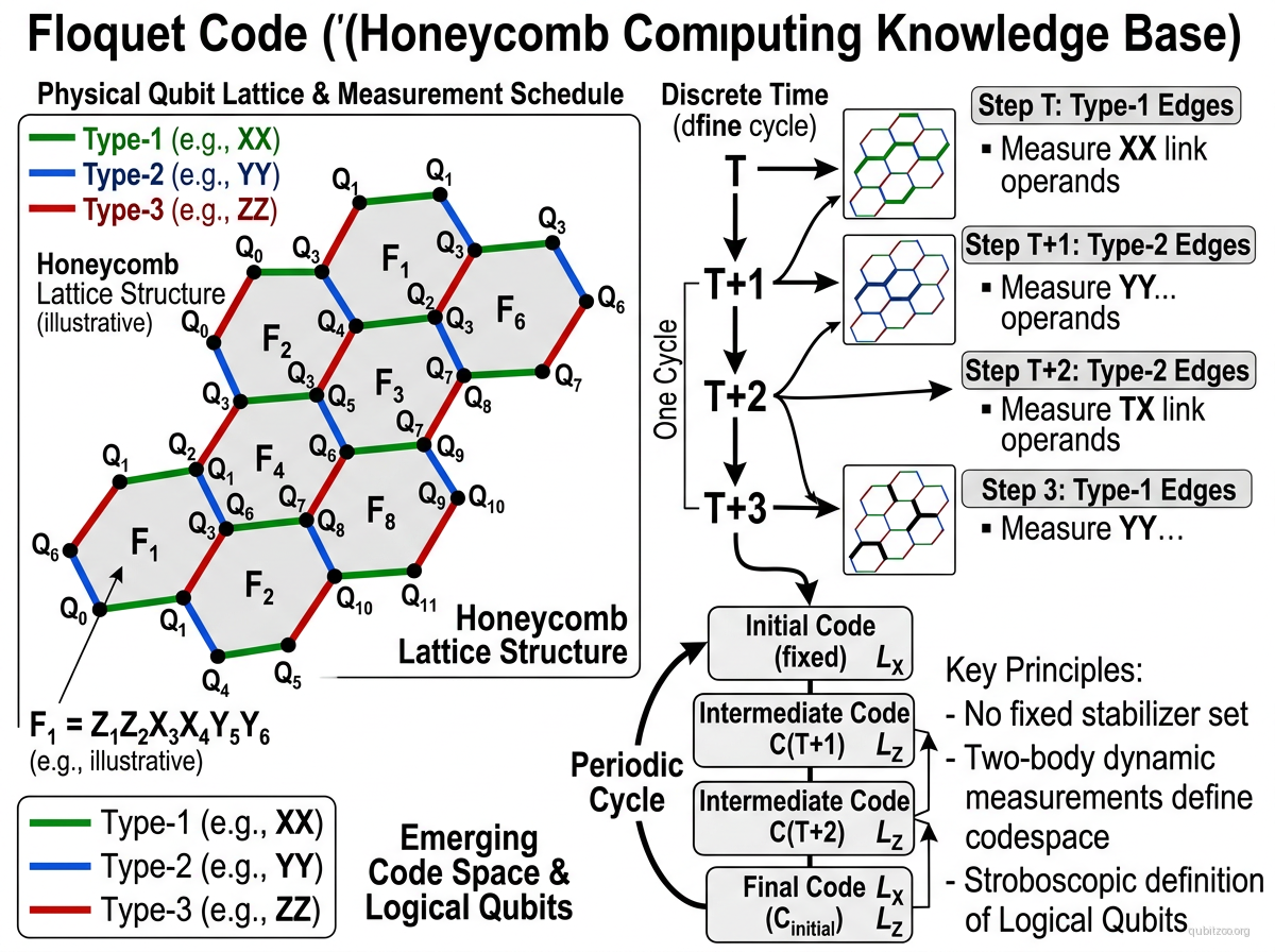 Introduced by Hastings and Haah (2021), the honeycomb Floquet code is the prototypical example. The physical qubits sit on vertices of a honeycomb lattice, and at each time step, two-body Pauli measurements (XX, YY, or ZZ) are performed on pairs of qubits sharing an edge. The three edge colors are measured in a repeating 3-step cycle.