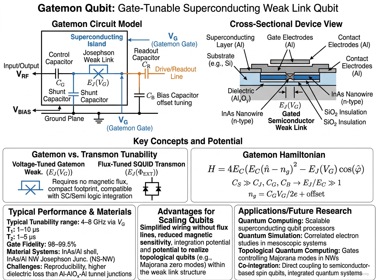 The gatemon is a superconducting transmon-style qubit where the conventional tunnel-barrier Josephson junction is replaced by a semiconductor nanowire (typically InAs or InAs/Al) with a gate-tunable weak link. The supercurrent through the nanowire depends on the gate voltage applied to the semiconductor channel, making — and therefore the qubit frequency — voltage-tunable rather than flux-tunable.