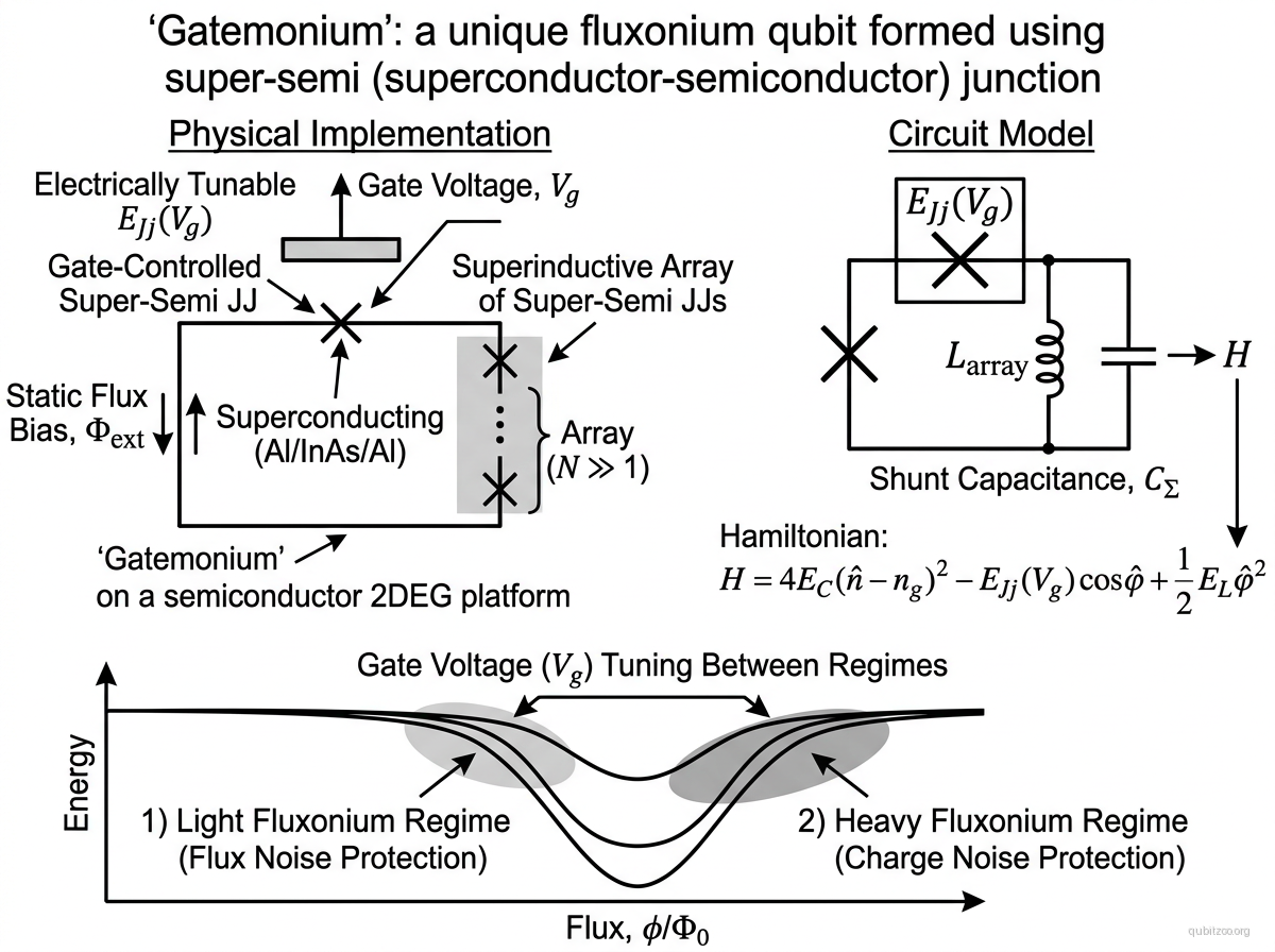 Combines the gatemon (gate-tunable semiconductor Josephson junction) with a fluxonium-style superinductive shunt. The Hamiltonian: