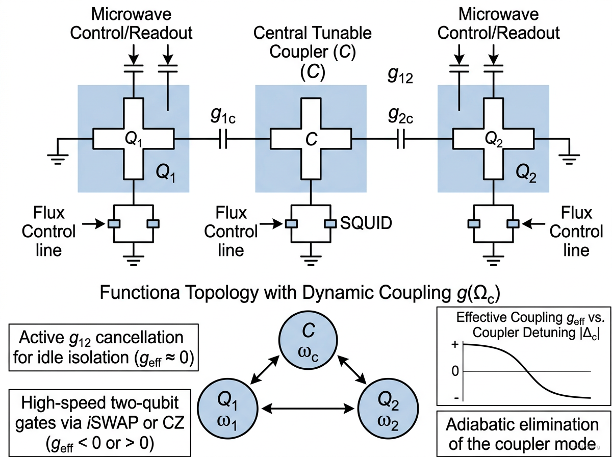 The tunable coupler is itself a frequency-tunable transmon-like element placed between two computational qubits. By adjusting its frequency (via a flux line), the effective qubit-qubit coupling can be tuned from a finite positive value through zero to a finite negative value. This enables: