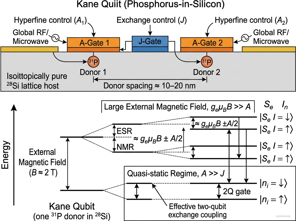 The Kane qubit, proposed by Bruce Kane in 1998, encodes quantum information in the nuclear spin of individual donor atoms embedded in isotopically pure . The nuclear spin () of phosphorus has extraordinarily long coherence times — has been demonstrated — because the nuclear spin couples very weakly to the environment.