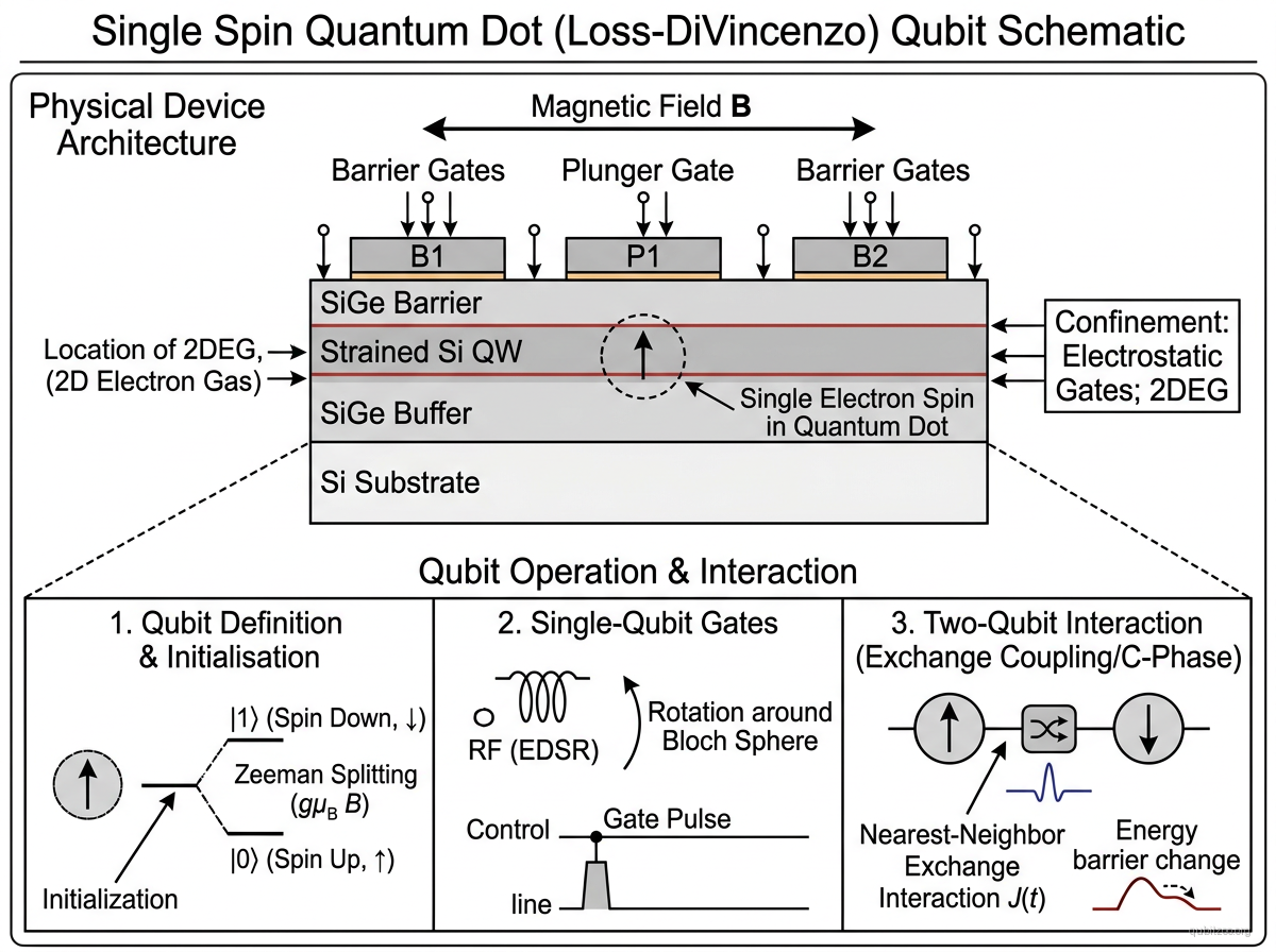 where is the tunneling matrix element and is the charging energy. Pulsing gives , which combined with single-qubit Z-rotations (via local magnetic fields) forms a universal gate set. Spin coherence times are inherently longer than charge coherence times since spin is insensitive to electric field fluctuations.