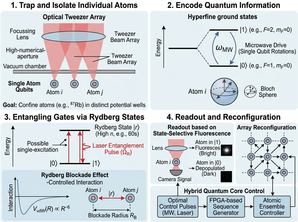 Neutral atom platforms trap individual alkali atoms (⁸⁷Rb, ¹³³Cs) or alkaline-earth atoms (⁸⁸Sr, ¹⁷¹Yb) in tightly focused optical tweezer arrays. Qubit states are encoded in two hyperfine ground states |0⟩ and |1⟩, which have long coherence times due to weak coupling to the environment. Single-qubit gates are driven by microwave or two-photon Raman transitions. Two-qubit entangling gates use the Rydberg blockade mechanism: when one atom is excited to a high-lying Rydberg state (n ~ 50–100), the strong van der Waals interaction shifts the doubly-excited state out of resonance, creating a conditional phase.