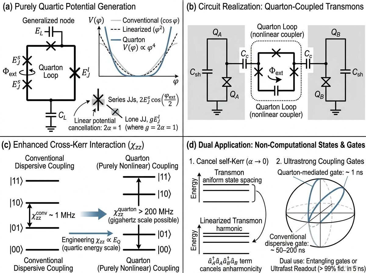 The quarton is not itself a qubit but a coupler that mediates interactions between other circuit elements. Its key innovation is that it couples two linearly decoupled transmon qubits with a gigahertz-scale cross-Kerr interaction () — an order of magnitude stronger than achievable with conventional dispersive coupling. At the same time, the quarton’s positive potential can cancel the negative self-Kerr (anharmonicity) of a transmon, effectively linearizing it into a harmonic resonator. This dual capability enables two breakthrough applications: (1) ultrafast two-qubit entangling gates and (2) ultrafast qubit readout with >99% fidelity in 5 ns.