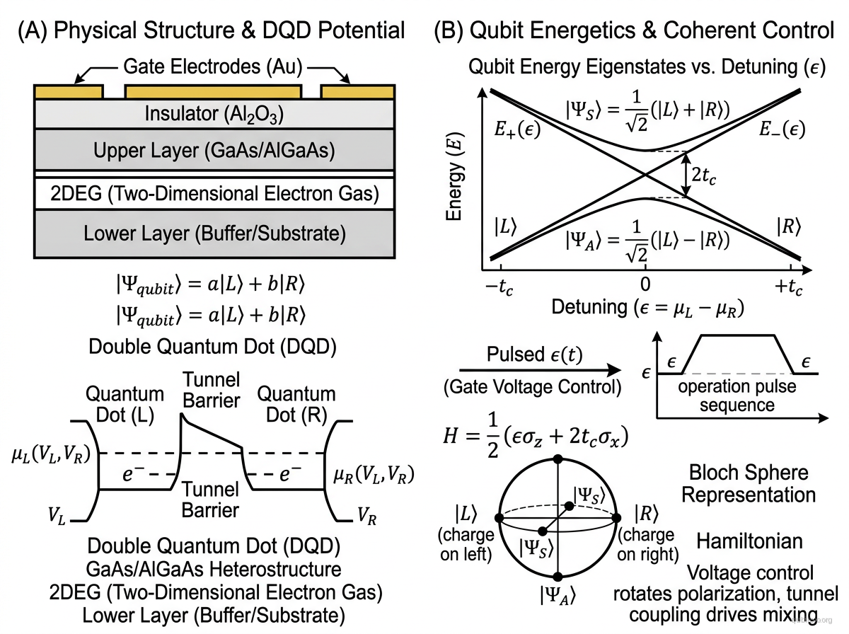 where is the detuning (gate-voltage controlled) and is the tunnel coupling. At zero detuning (), the eigenstates are symmetric/antisymmetric superpositions split by . Coherent charge oscillations between dots demonstrated by pulsed gate voltage.