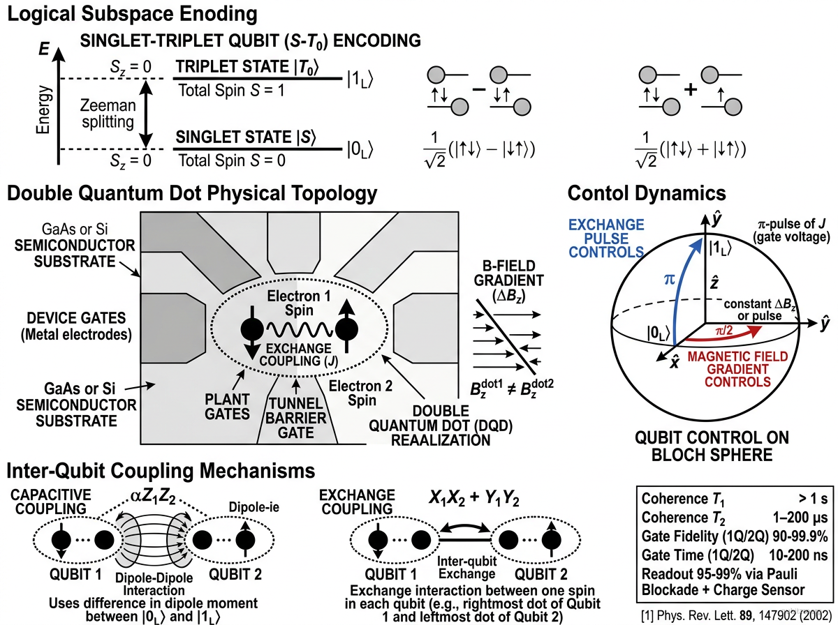 Both states have total , providing first-order insensitivity to uniform magnetic field fluctuations. Control: exchange interaction (gate voltage) rotates around of the logical Bloch sphere; magnetic field gradient between dots rotates around .