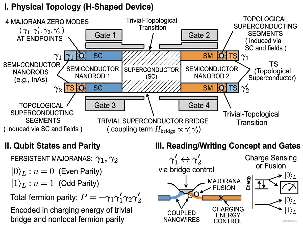 Four MZMs are hosted at the endpoints of two parallel topological superconductor segments connected by a trivial superconducting bridge (forming an “H” shape). The logical qubit is encoded in the parity degree of freedom: