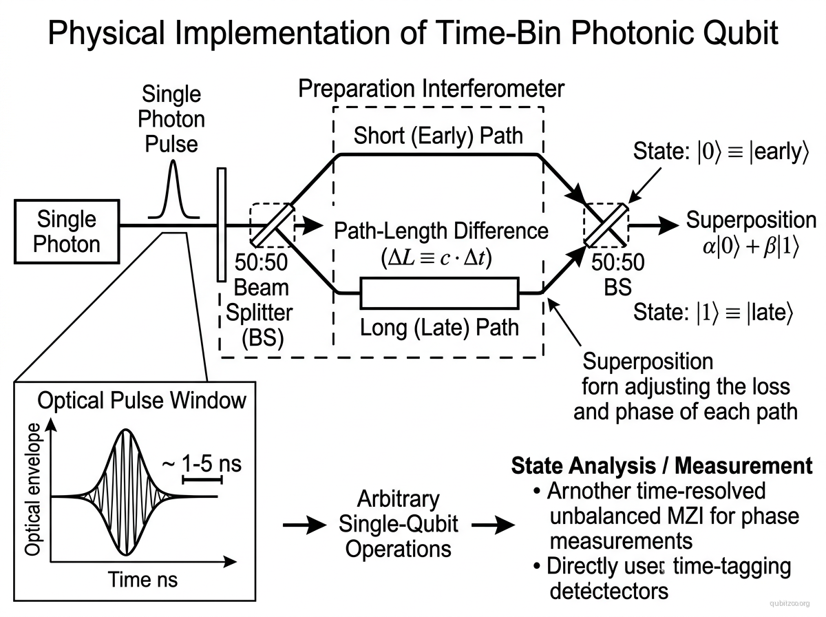The time-bin qubit encodes quantum information in the temporal degree of freedom of a single photon: and , corresponding to two well-separated time slots (typically ) within a single optical pulse window. Superposition states are prepared by passing a single photon through an unbalanced Mach-Zehnder interferometer, where the path-length difference defines the time-bin separation.