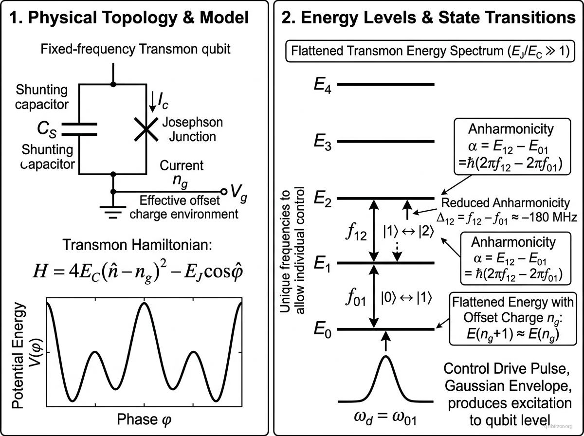 The transmon (short for “transmission-line shunted plasma oscillation qubit”) is a superconducting charge qubit derived from the Cooper pair box by dramatically increasing the ratio . Koch et al. (2007) showed that operating at (vs. for the CPB) exponentially suppresses charge dispersion — the sensitivity of transition frequencies to offset charge — while reducing anharmonicity only as a weak power law. This tradeoff is the central design insight: charge noise immunity improves exponentially while the penalty in anharmonicity is manageable.