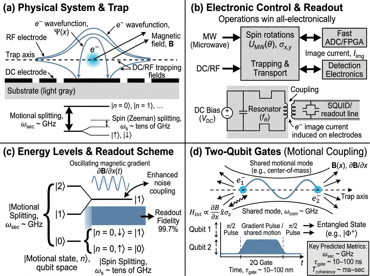 Unlike trapped ions, electrons have no internal level structure beyond spin, eliminating laser-based state preparation, manipulation, and readout entirely. All control would be electronic: microwave fields for spin rotations, dc/rf electric fields for trapping and transport, and image current or cavity-coupled detection for readout. This “all-electronic” approach avoids the laser system complexity that is a primary scaling bottleneck for trapped-ion systems.