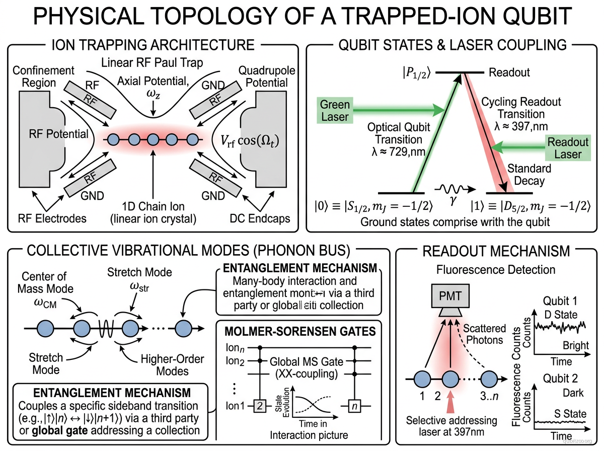 Trapped-ion quantum computing encodes qubits in the internal electronic states of individual atomic ions confined in electromagnetic traps (typically linear Paul traps using oscillating RF fields). The idea was proposed by Cirac and Zoller in 1995, who showed that the shared motional (phonon) modes of a chain of ions could serve as a quantum bus for entangling gates.