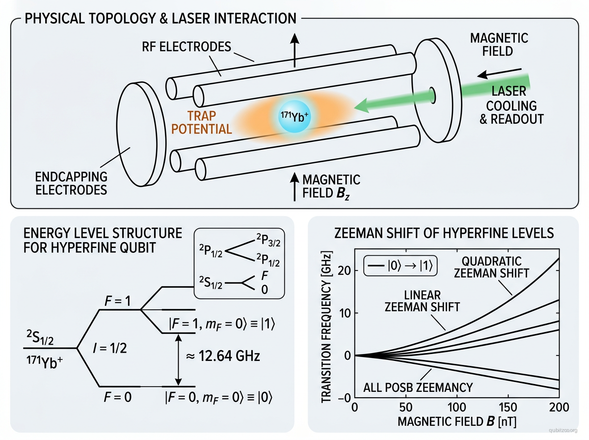 The ytterbium-171 hyperfine qubit encodes quantum information in the two hyperfine clock states of the ion’s ground-state manifold: and , separated by 12.642812 GHz. Both states have , making the qubit first-order insensitive to magnetic field fluctuations — the transition frequency shifts only quadratically with field, enabling exceptionally long coherence times.